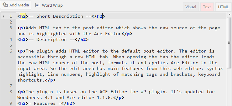 The plugin adds HTML editor to the default post editor. The editor is accessible through a new HTML tab. When opening the tab the editor loads the raw HTML source of the post, formats it and applies Ace Editor to the input area. So the edit area has main features from this web editor: syntax highlight, line numbers, highlight of matching tags and brackets, keyboard shortcuts.