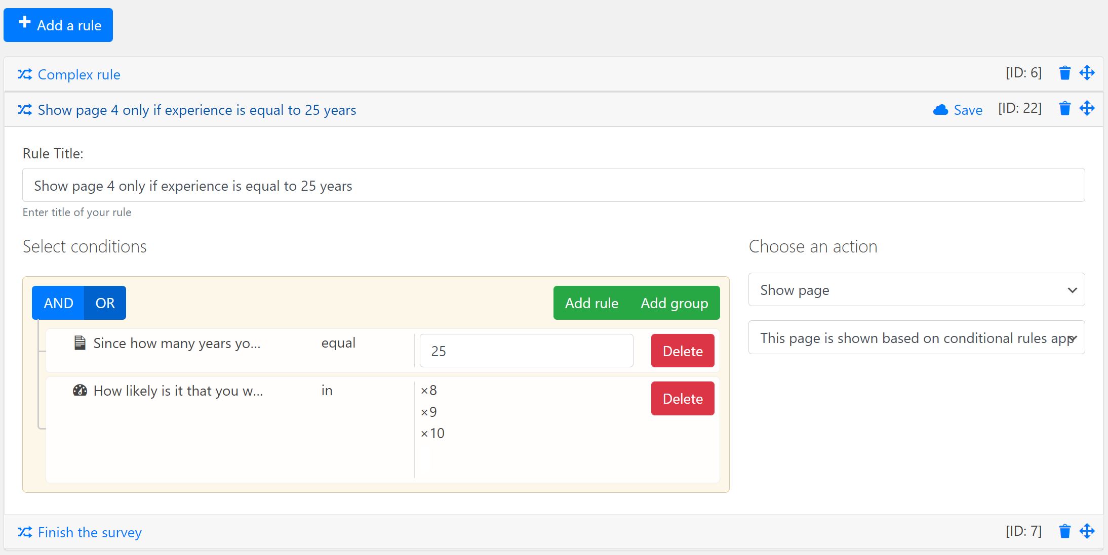 - Show personalized questions to the users with built-in skip/conditional logic. Set up conditional rules on all your questions with an advanced rules builder.