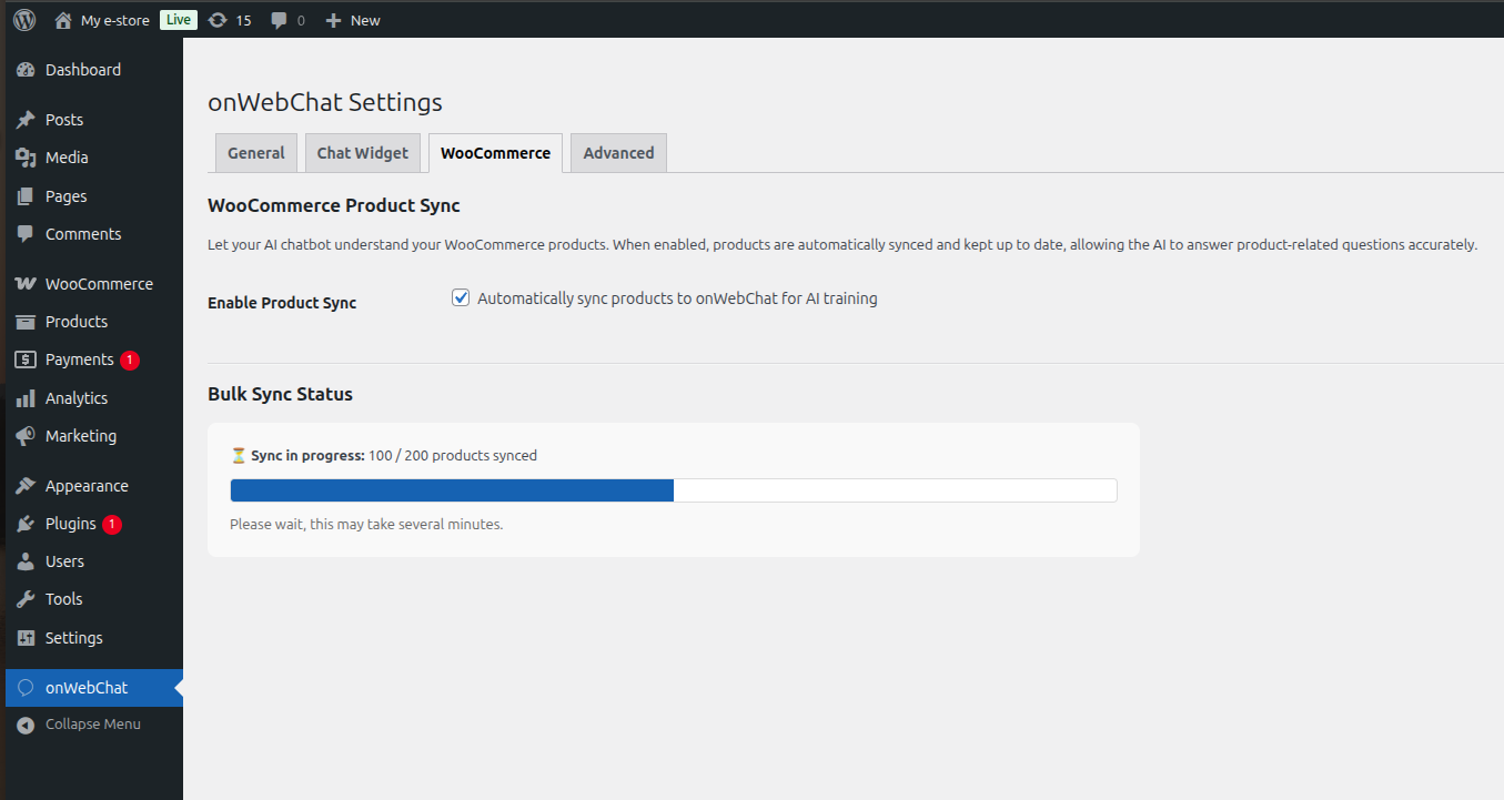 If you have WooCommerce installed, you can enable automatic product synchronization in the onWebChat settings. This allows your AI chatbot to learn about your products and provide accurate product information to customers. Products are automatically synced when created, updated, or deleted. You can also perform a bulk sync of all existing products.