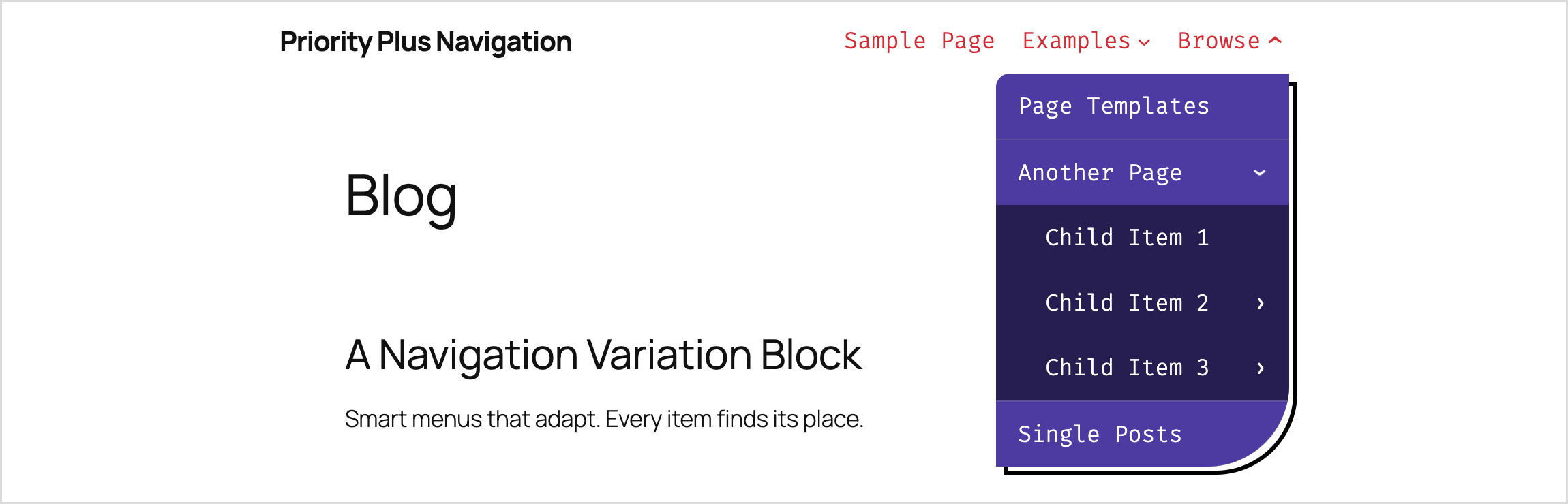 • Priority Plus Navigation provides a highly customizable responsive variation of the core navigation block.