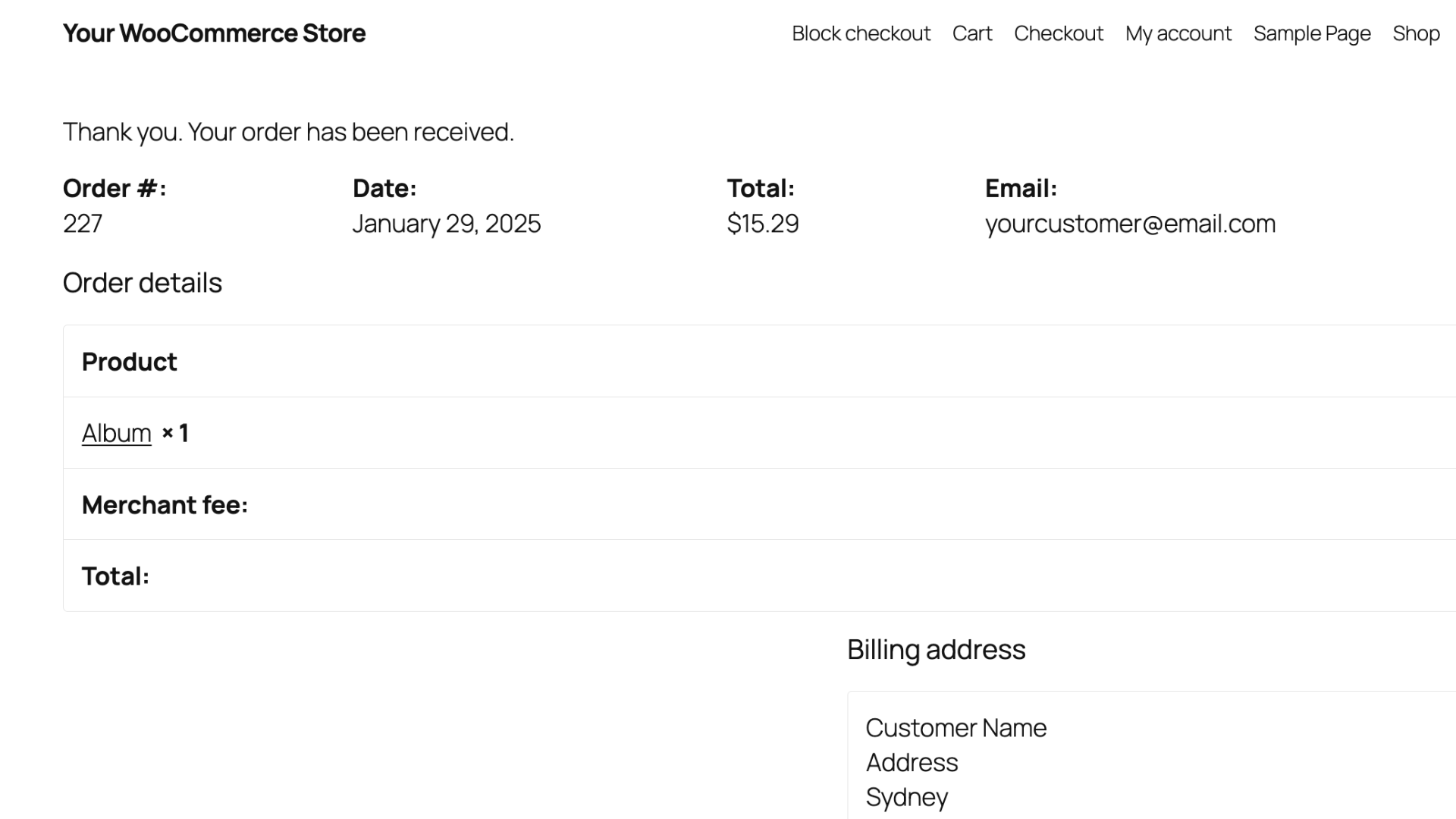 After a successful payment, customers are then directed back to your store and provided transaction details.