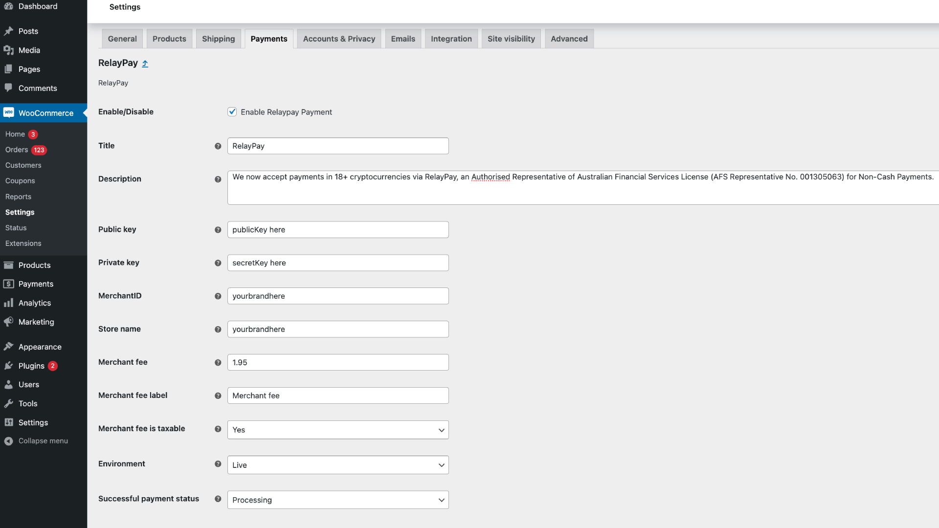 - Edit the RelayPay plug-in’s settings at > WooCommerce > Settings > Payments > RelayPay.