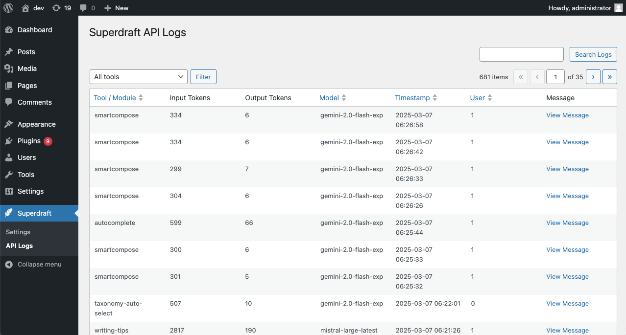 Superdraft includes detailed logging to track usage, API requests, and responses.