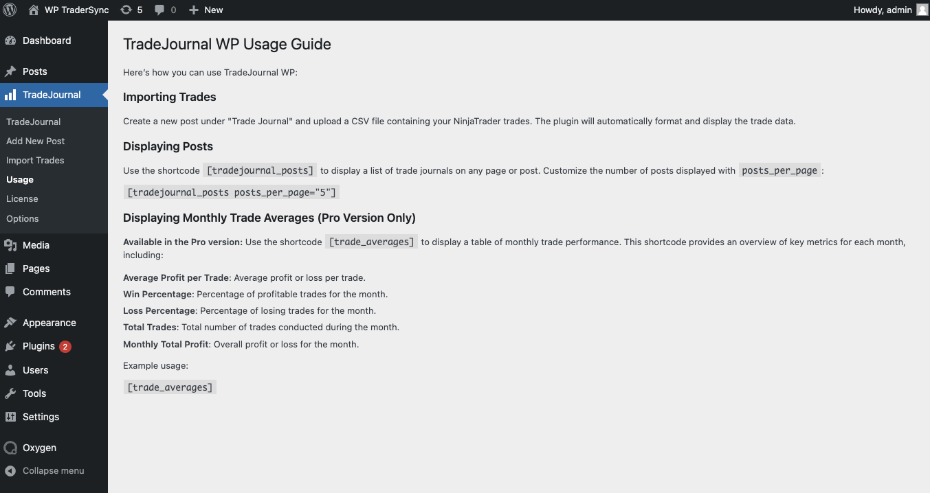 – Display a monthly trade performance summary with the [trade_averages] shortcode, showing metrics like average profit, win/loss percentage, and total trades.