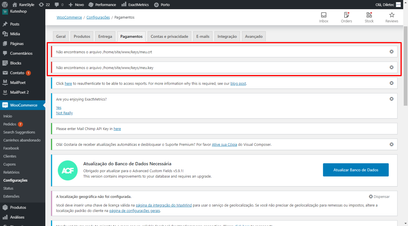 3. Vá em configurações de Pagamento do WooCommerce e ative o Banco Inter;