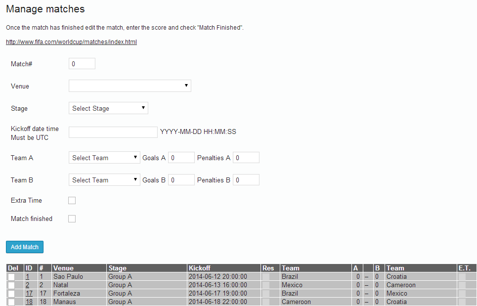 As each match is complete, use the Matches admin menu option to enter the goals scored and check the ‘Match Finished’ checkbox.