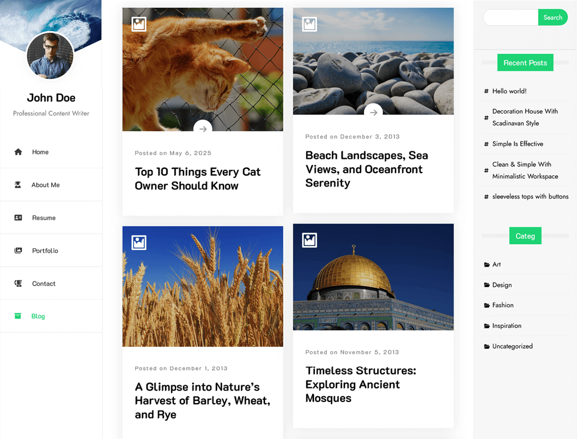 The Personal Resume Portfolio child theme is a professional, simple, and digital solution for building a striking online presence. Designed with a sleek layout and modern style, this theme is perfect for showcasing your resume, CV, blogger profile, or online portfolio with clarity and creativity. Whether you’re a graphic designer, template developer, photographer, writer, or remote worker, this theme delivers a winning structure that makes an unforgettable impact.