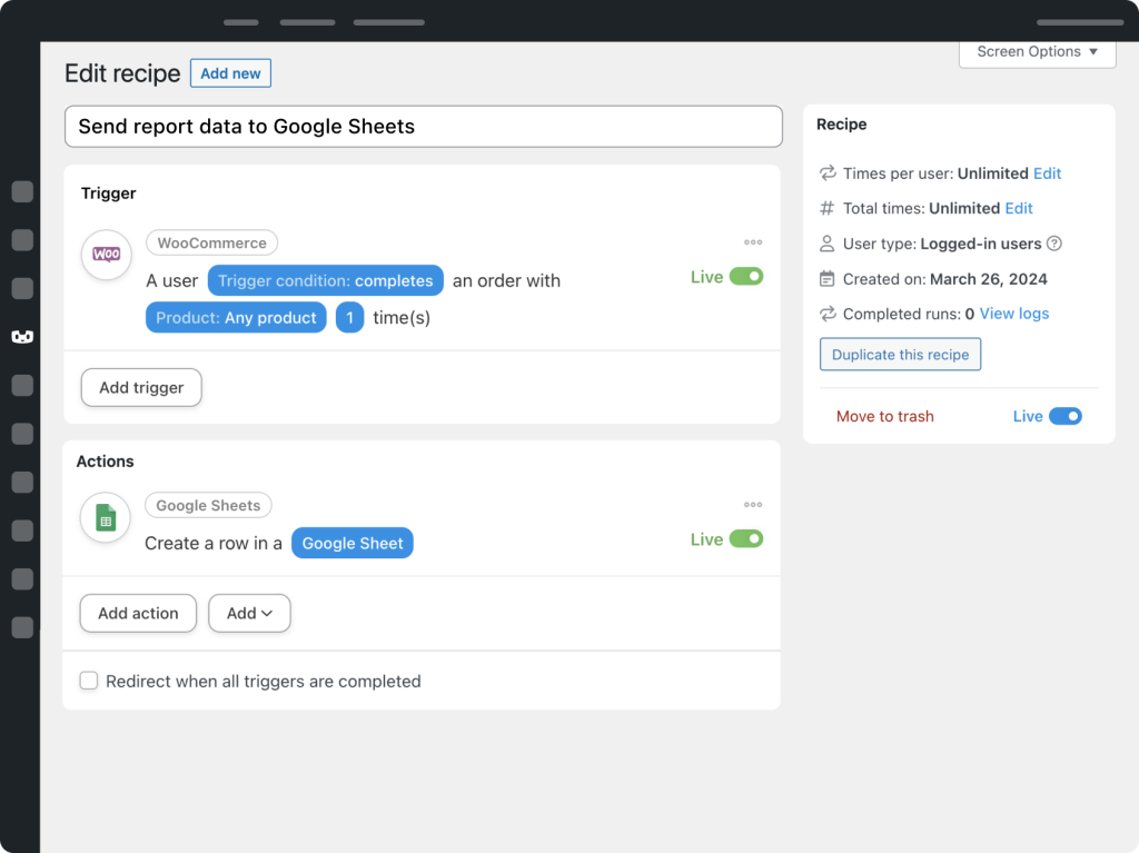 Uncanny Automator works with meta data for users, posts, orders, courses, events and much more, letting you build custom reports across plugins so you can see exactly what you need for your business.