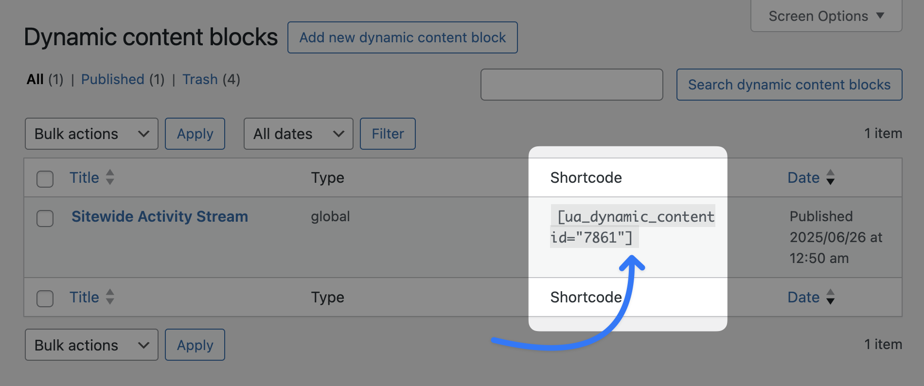 You can now embed this dynamic block anywhere on your website by adding it to any page or post in the block editor, or with the shortcode from the “Dynamic content blocks” screen.