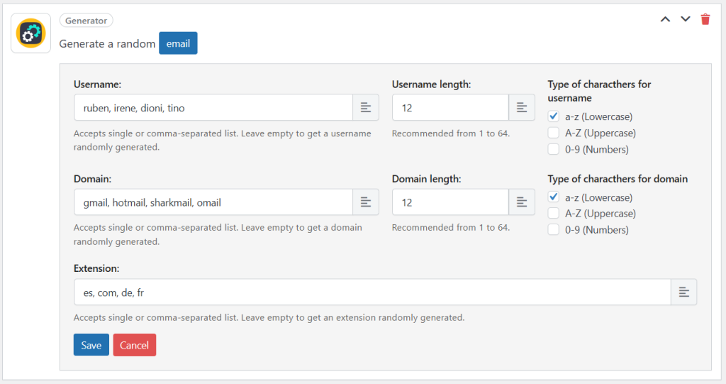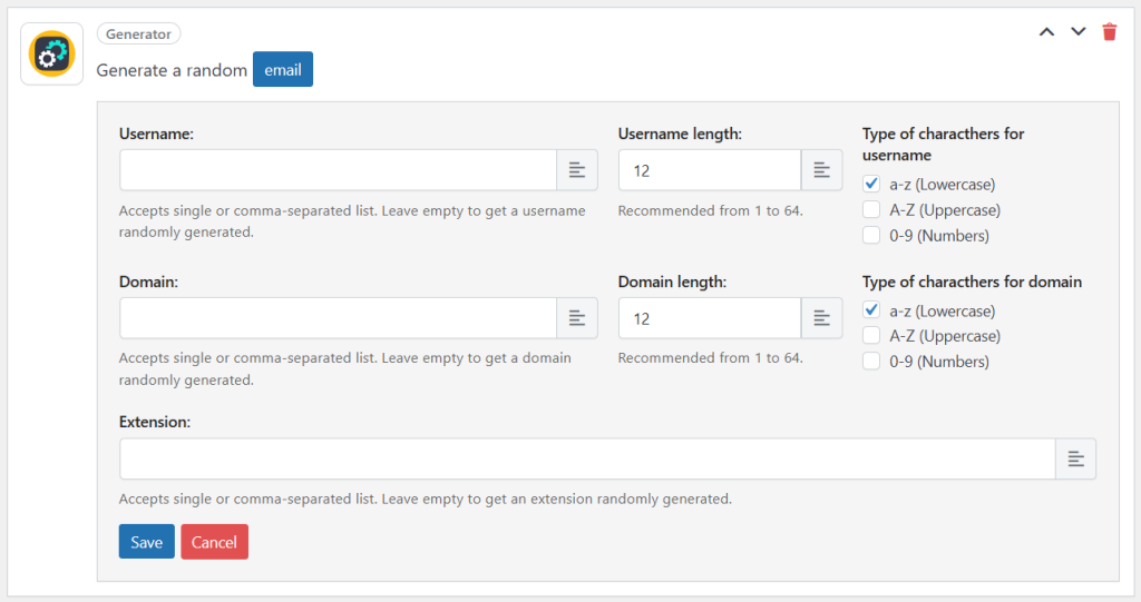 Here you have options for the username, domain and extension. If you leave all or some of them blank, the action will generate that part completely randomly.