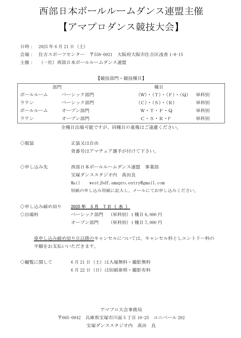 6月21日(土)と22日(日)に開催予定の『西部日本ボールルームダンス連盟主催 級別ダンス競技大会』、『西部日本ボールルームダンス連盟主催 アマプロダンス競技大会』、『鳥居杯争奪 第25回 プロフェッショナル統一全日本10ダンス選手権大会』、『2025年 全日本10ダンス選手権大会』、『ジャパン・ボールルームトロフィー』、『ジャパン・ラテントロフィー』の大会要項です。