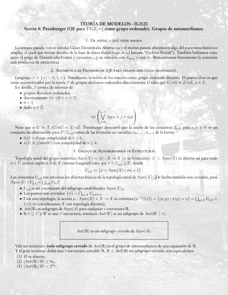 Este semestre, que empezó bien tarde (final de octubre) en la Universidad Nacional, doy dos cursos: Lógica Matemática (Carreras de Matemáticas y Computación) y un curso en principio de posgrado: Tópicos Avanzados de Lógica II (Estabilidad en primer orden y en clases no elementales).
