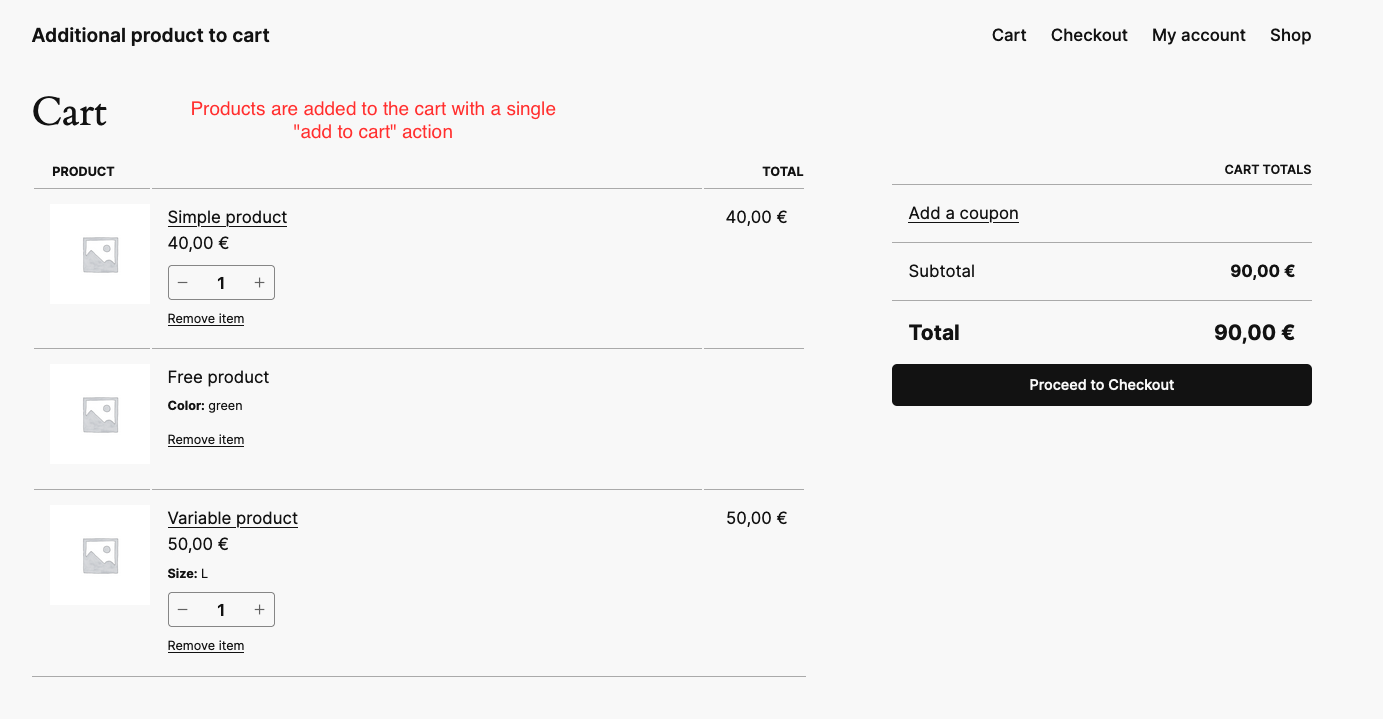 Additional product to cart is a WooCommerce plugin that gives the opportunity to select other products on a simple or variable product, without creating a grouped product, and add them to the cart on a single “add to cart” action. Perfect to increase your sales.