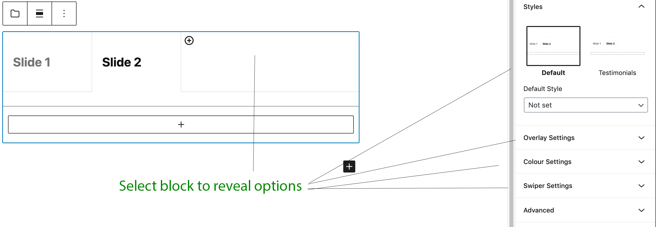 - Use any block available in Gutenberg to create your slider