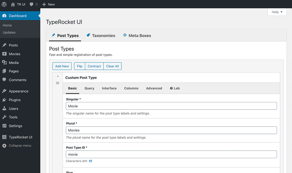 Add custom post types and taxonomies to your website without code. With the TypeRocket UI plugin, you can register advanced post types and advanced taxonomies without knowing any code. Plus, TypeRocket UI goes beyond what you expect from a typical post type registration plugin by providing advanced features like: