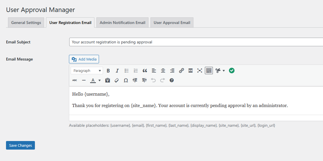 - Reset password button — use the {reset_password_button} placeholder in the User Approval Email to send new users a one-click “Set Password” link (respects custom login URLs and wp_lang)