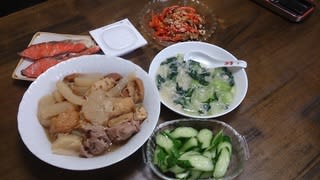 おでん省略版、青梗菜とホタテ、きゅうり漬け、パプリカとツナ缶、シャケ、納豆