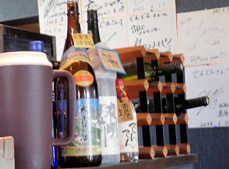 夜の営業用でしょうか、日本酒が置いてあります。銘柄は、「大雪渓」、「夜明け前」で、どちらも信州のお酒です。