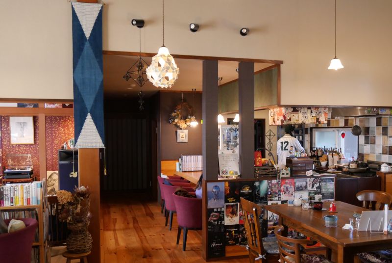 キッチンの前にはカウンター席があります。左奥には、「きたや」の所持レコードのディスコグラフィーが置いてあります。