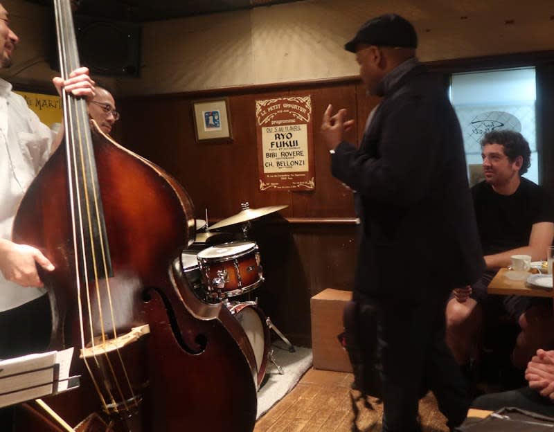 後半遅い時間にジーン・ジャクソン(ds)さんがお店に顔を出して聴いていたのですが、山田さんの誘いで「Bolivia」でドラムを演奏してくれました。トリオの3人は白熱した演奏を繰り広げ、シンバルからは金粉銀粉が舞いだしているかの如くのサウンドがしていました。