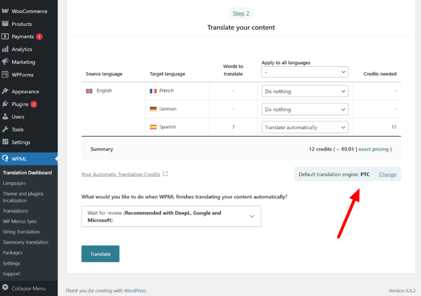 - Finally, choose a translation method. For the best translation quality, we recommend using PTC (Private Translation Cloud) – WPML’s most accurate AI translation engine