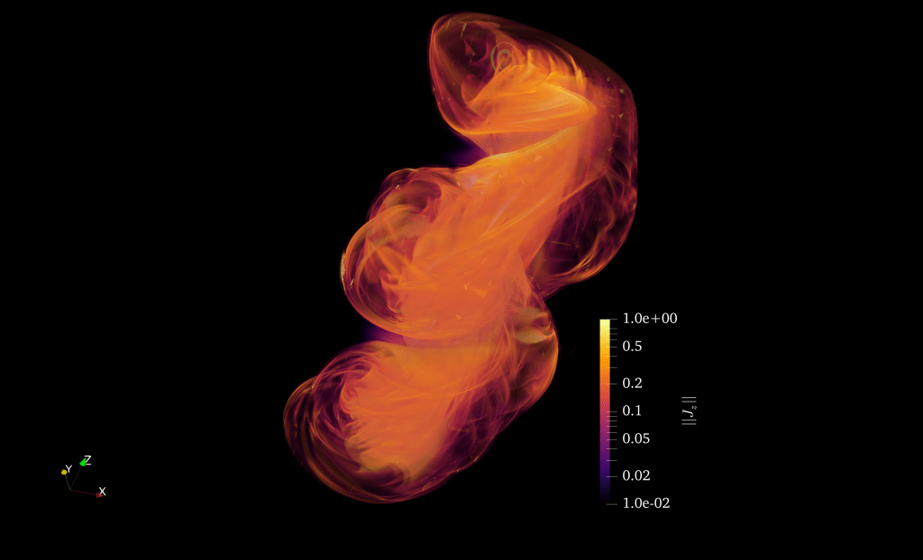 Flux tubes themselves can become kink-unstable, and curl up, as you can see in the image above. Zooming in on such a flux tube, we can study the evolution of the kink instability, and the development of current sheets at the edges of the tube. In the image below you see a simulation of a single kink-unstable flux tube, that can serve as a model for a black hole jet, or for typical magnetic structures forming in black hole coronae.
