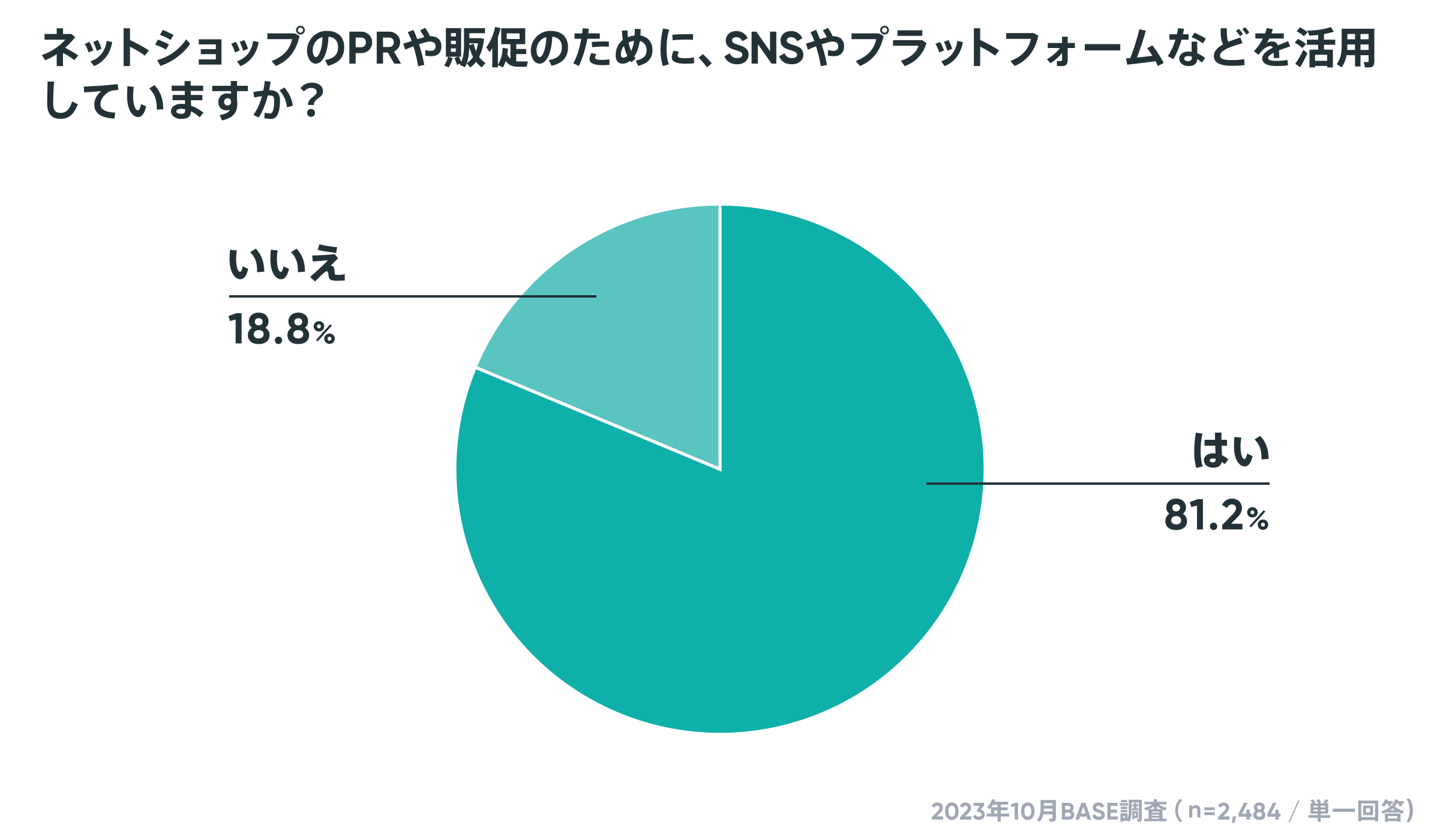 2023年にBASEがおこなった調査によると、ネットショップのPRや販促のためにSNSやプラットフォームなどを活用するショップは81.2%と高い水準を保っています。積極的に活用しているSNSは1位が「Instagram」(57.6%)、2位が「X(旧Twitter)」(23.6%)です。