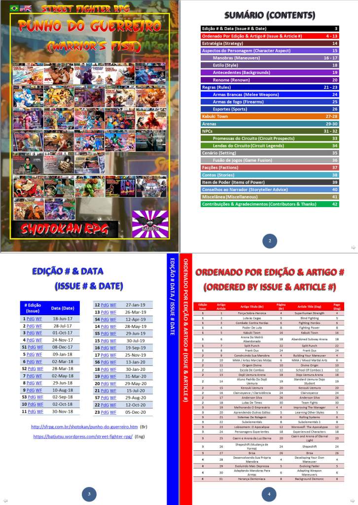 Issue 31. Here is a link to the folder of Street Fighter translations, which includes all the issues of Warrior’s Fist (PdG), the epic Circuit Guide, Glory Times, Solo Rules, Spartacus, and the Mortal Kombat core and Shinnok. The whole folder can be downloaded as a Zip file 🙂 The Punho do Guerreiro (Warrior’s Fist) PDF Article List has been updated, as has the online spreadsheet. This PDF and my other SFRPG creations can be downloaded from this folder.