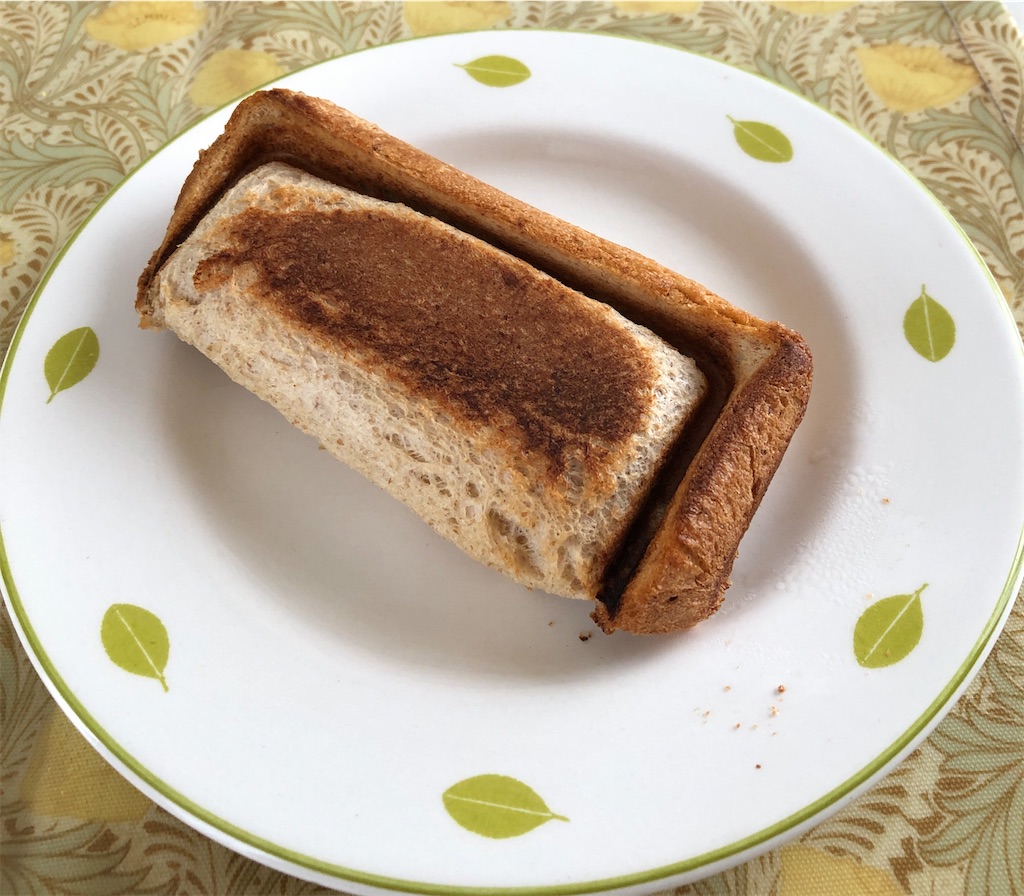 パンの片側に板チョコを乗せて、さらにその上に半分に折ったバナナを乗せて、パンをぐるっと折って、ホットサンドメーカーを閉じて、両面焼いて出来上がり🥳