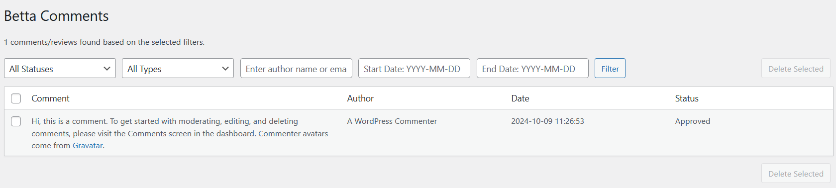 Once installed and activated, Betta Comments adds a new menu item under the “Comments” section in your WordPress admin dashboard. From there, you can bulk delete, filter, and manage your comments and reviews.