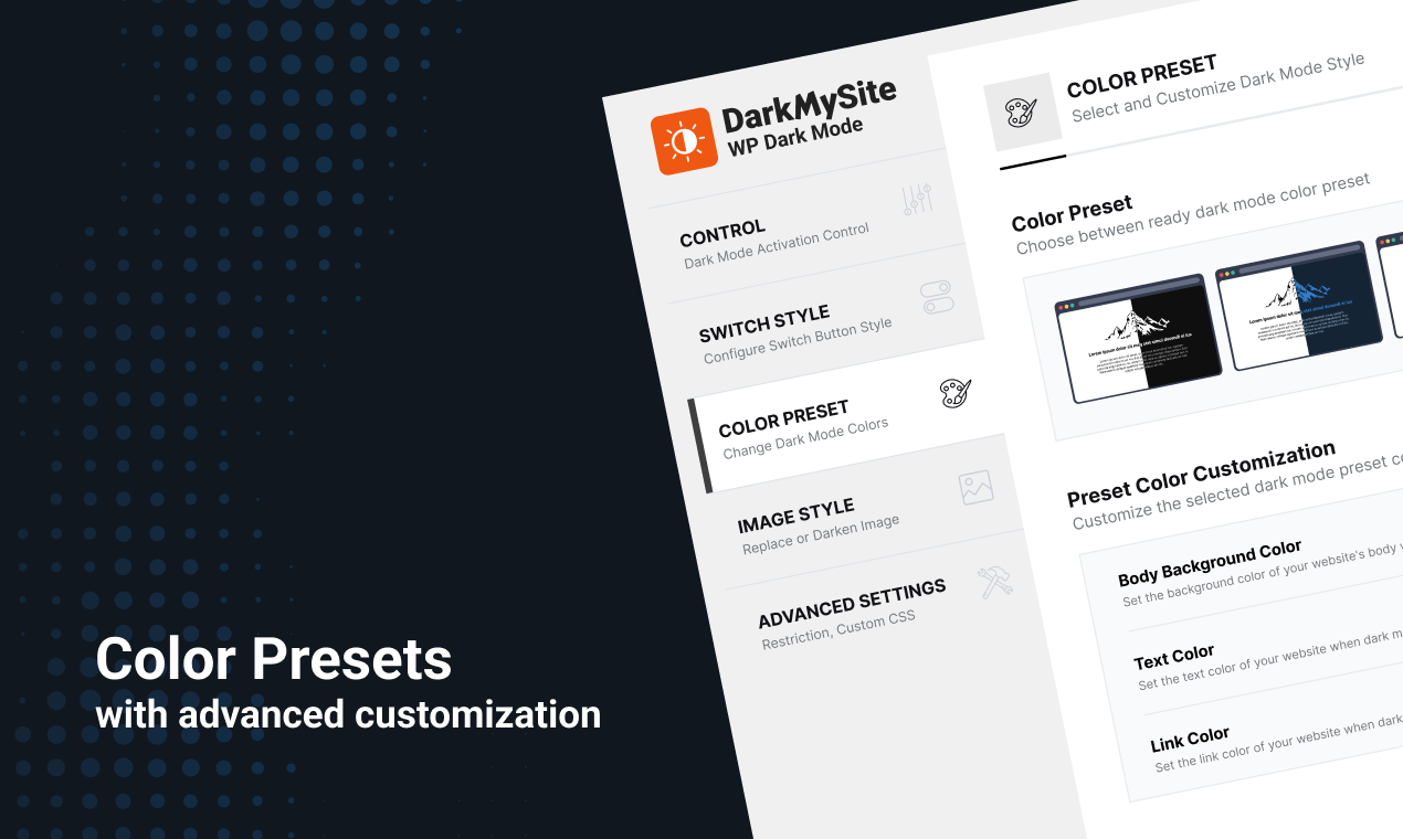 With its extensive customization options, including a variety of floating switch designs, color presets, and image appearance control, DarkMySite enables you to create a dark mode theme that perfectly aligns with your website’s style and branding. Easily add a switch to your menu, display it anywhere on your site with a shortcode, or set it as the default theme – DarkMySite makes it all possible.