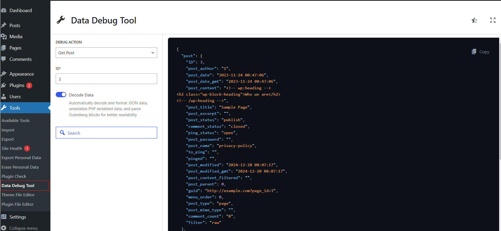 - Smart data decoding – see Gutenberg blocks, serialized data, and JSON in readable format