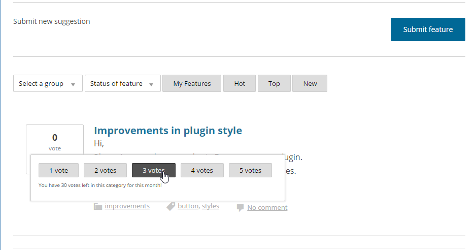 [feature_request_user_votes hide_total=”off” hide_remaining=”off” groups=”2,5,12″]