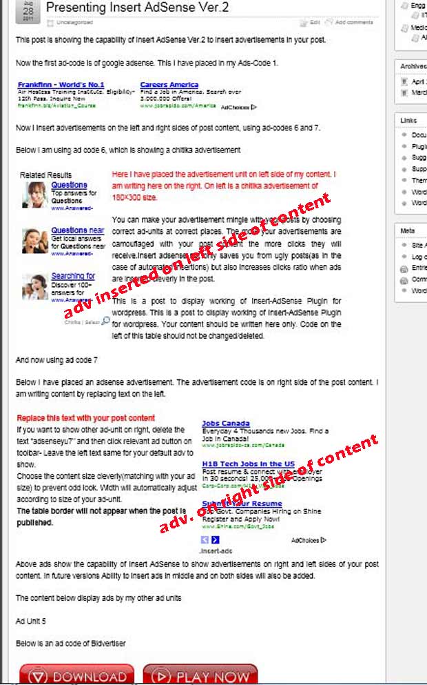 Ads-code 6 and 7 also adds a table in your post so that you can write post content on right or left side of ads.