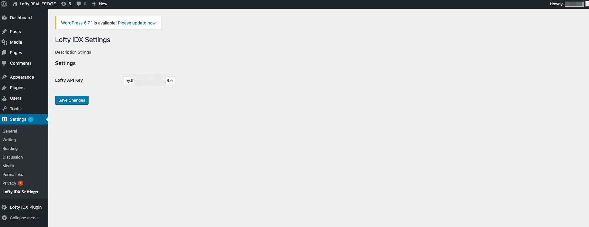 Admin Settings Page – Obtain your unique API key from Lofty and enter it here to activate the Lofty IDX Plugin.(Settings>Lofty IDX Settings)