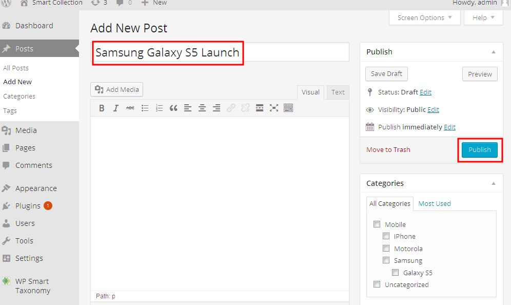 wp-smart-taxonomyfolder to the/wp-content/plugins/directory OR search for “WP Smart Taxonomy” from your WordPress admin. - Activate the plugin through the ‘Plugins’ menu in WordPress.