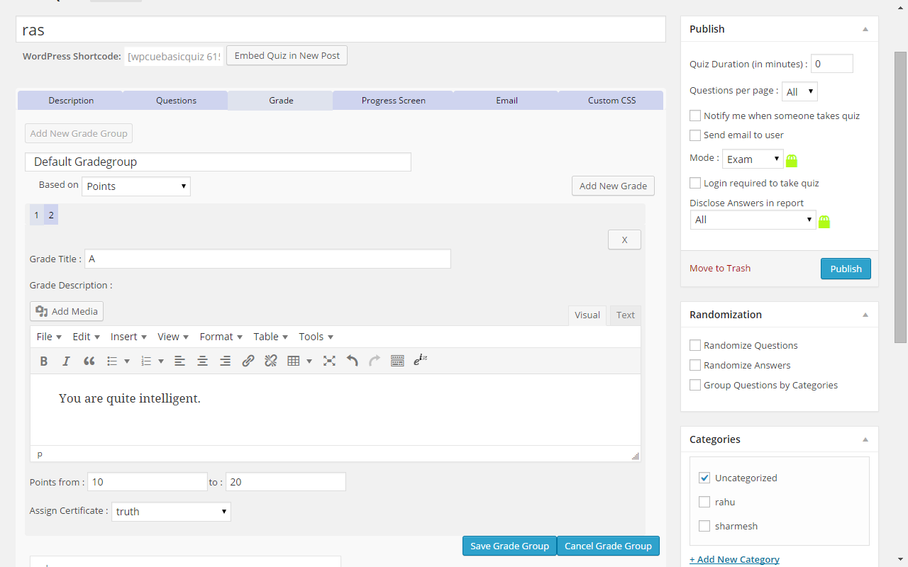 You can also issue certificate on the basis of grade attained by the user. - How do I show the quiz to the visitors of my blog?