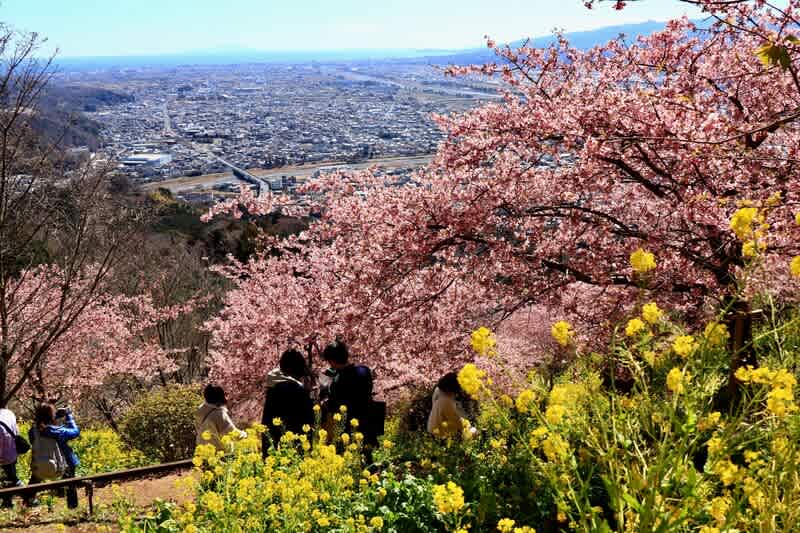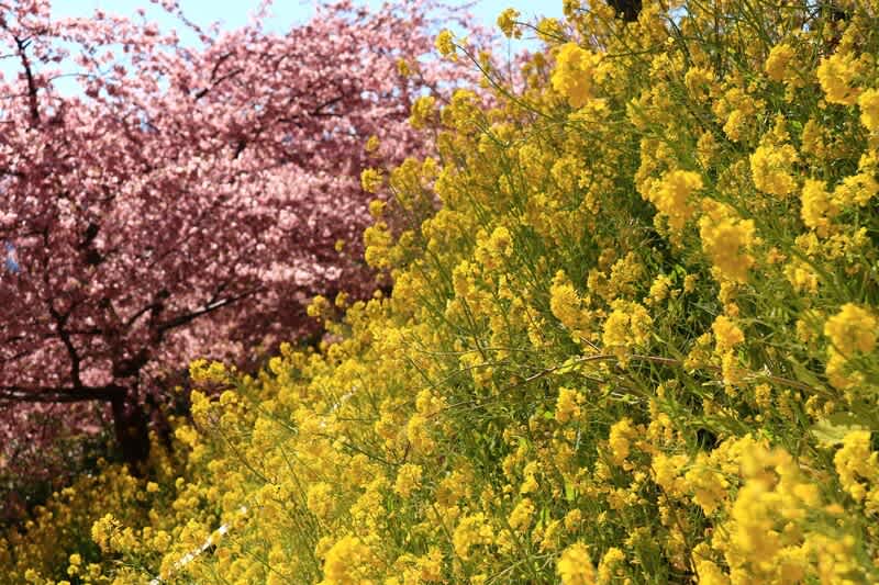 青い空、鮮やかピンクの河津桜、そして黄色の菜の花。