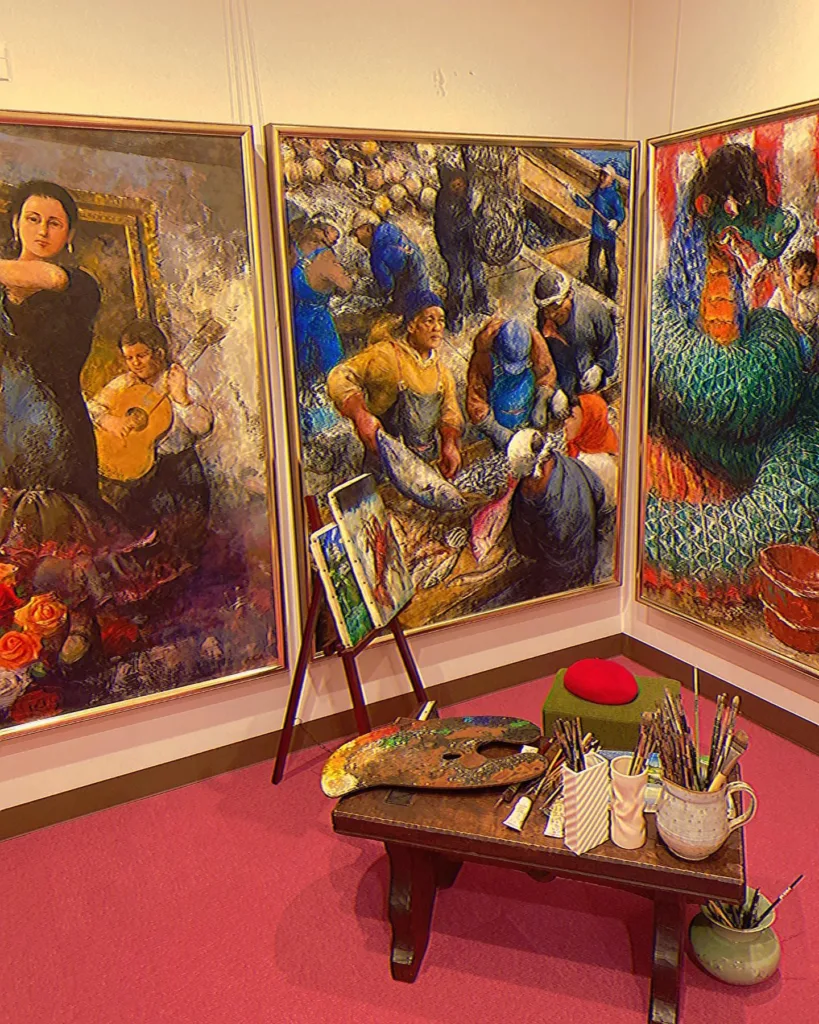 芸能人の絵画作品をメインに彫刻や古美術品など多彩なアートを鑑賞可能です。別府タワーの模型や画家になりきって撮影できるスポットもあり、観光気分も味わえます。