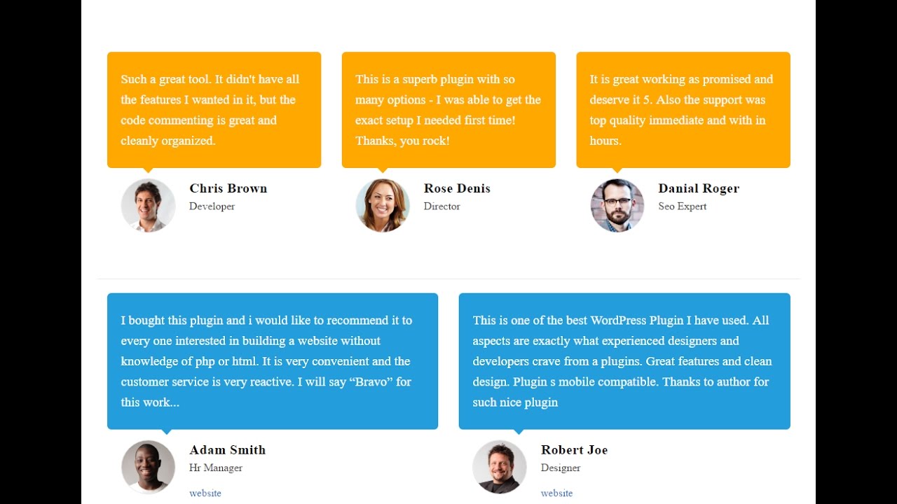 - Responsive and eye-catching design with individual CSS for each testimonial