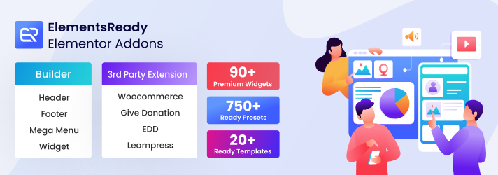 ElementsReady comes bundled with top-of-the-line features such as – Header Footer Builder, MegaMenu builder, Blog Builder, WooCommerce Widgets, EDD Widgets, Learn Press Widgets, Premium Elementor Templates, an Elementor Template Library, and the ultimate plugin also offers 90+ functional use case specific Elementor widgets in a lightweight performance focused plugin package.