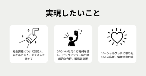 - DAOへいただくご寄付を使い、ビッグイシュー日本の継続的な発行、販売者支援