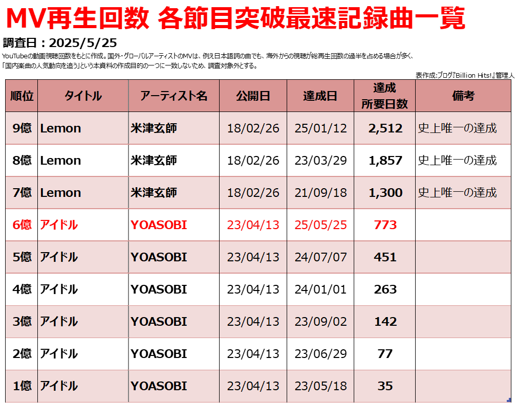 *1:しかし中には楽曲人気ではなく広告による再生を主因としてMV1億再生突破を果たしたと断言できる楽曲も存在するため、100%そうとは言い切れない点には注意が必要である。SixTONES「こっから」が国内で初めてその事例となっている。