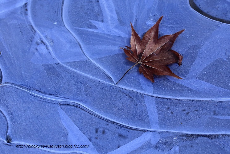 おはようございます。氷紋の枯葉が1枚、良く見ると枝と葉の付根が氷の中に、これで私が紅葉の葉を置いたという事は打ち消された。どうせなら赤い綺麗な葉っぱならいいのだが残念な事だ。 朝8時19分の撮影です。 今年は、12月7日夜中に雪が降り、おまけに少し雨交じりだったと思われる。 お陰様で、この様な氷紋は撮影できない。家にいて気持ちが落ち着かない 早く良くなって外に出たいです。(買い物は全て...