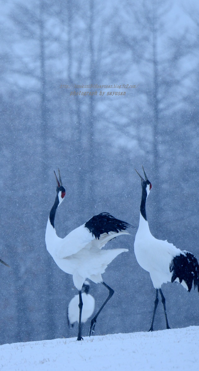 おはようございます。丹頂の鳴きあいで、私なりの拘りがあります。丹頂の鳴きあいは、雌雄が歩きながら鳴きあいをするのですが、鳴きあう姿がやはり優雅でなければ撮影していても意味がない。私は、歩きながらでも雌雄の足が揃うまでシャッターを切らないことにしています。その例を今回は載せてみました。 よく足元を見てください、雄・雌ともに足が揃っていると思います。これでもよいのですが、やはり両足が地面についていた方...