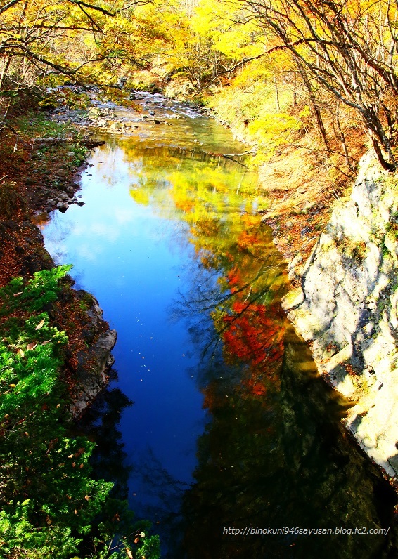 おはようございます。車を降りて、2分ほど歩くと小川の流れる音が聞こえてきた。よく見ると赤い鉄製の橋が見えた、かなり古い感じがした。その橋の中ごろから下を見ると、結構な深さのあるミニ渓谷の状態で水が淀んでいた。 よどんでいた水には岸にある紅葉が写りこんでいた。 更に川下へ20分くらい歩くと普通の橋がありその橋の中央からは、紅葉と川の流れが写欲をかき立てられ しばし時間を費やした。 目を更に奥のほう...