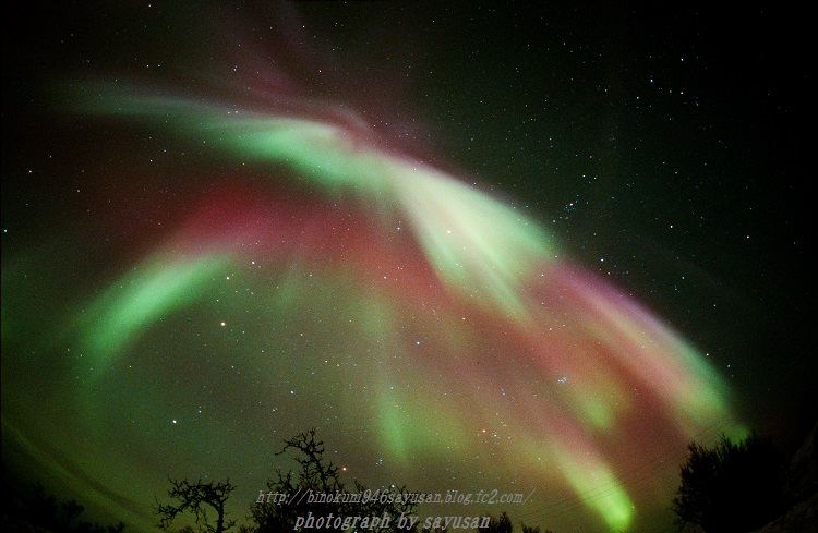 おはようございます。今は太陽が出て、とても気持ちの良い朝です。宇宙の一点がまるで爆発でも起こしたかのように光が広がった。今までの乳白色の帯のようなオーロラとは明らかな違いがあった。私にとっては、宇宙の静寂感の中での出来事は今まで見たことの無い出来事で、感動の連続であった。瞬間的に広まる速さ、形、色合いどれをとっても初めて見る宇宙ショウーの見事さに目を奪われ瞬間的にシャッターを押す事さえ忘れてしまう...