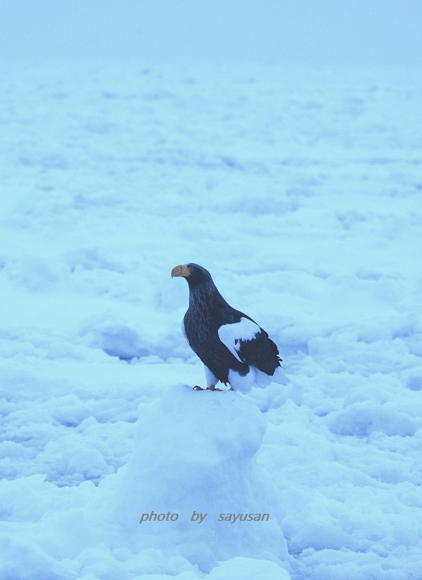 みなさんこんにちは。今日の釧路の最高気温は、+6℃になりそうです。これは、釧路に取っては4月上旬の気温ですねー、これでは雪が融けてしまいます。やはり寒い時は寒く、暑い時は暑い方がいいですね。今日もまた氷上の画になりますので、最後まで見てやってください。オジロワシよりオオワシの方が好きなもので、撮影する画もオオワシの方が多くなってしまいますね。撮影時間:6時21分 曇天で流氷上の撮影は難しい...
