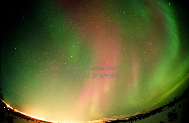 おはようございます。昨日、昨夜とすごい雨が降りました。久しぶりの豪雨で注意報も出ました、一夜明けてどのような被害があるのか心配です。空はまだ降り足りないような色した空です。さて、オーロラもいよいよ終盤をむか経てきました。管理の方法が悪いので、当時撮影したフイルムの行くえ不明が結構ありまして、オーロラの中と飛ぶ飛行機の光跡の画1枚も見当たらないのです。枚数にして、36枚撮り1本分はあるはずなんですが...