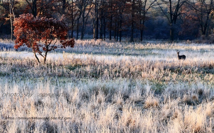 おはようございます。この絵は11月19日に音羽橋にゆく途中で、釧路市内北斗で撮影したものです。漸く光が当たり始めたころ霜の降りた草むらに佇みこちらを見ていたので、撮影してみた。 ここはよくエゾシカの出るところであるが、雄シカはめったに見ることができない。 朝霜が確りと降り、この霜の調子が良かったのでシルエットでも解るだろうとと考え シルエットにした。これだけでは画面がさみしいと思い左側の柏の紅葉を...